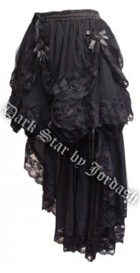 Dark Star Black & Green Gothic Satin Roses Gothic Hi Low Skirt. Quite the most breathtaking Gothic skirt we have ever seen! This is a three layer gothic skirt. Top layer is made of gathered black lace with black roses. The second layer is a short length gathered coloured synthetic silk with black lace trim. The third layer is long at the back with black lace trim and short at the front (hi low skirt) elasticated waist with drawstring/ribbon to fit a multitude of sizes. The underskirt is made from soft satin with stiffened net tulle over the top, then swags of ultra soft fine mesh edged with lace and decorated with organza roses and black satin ribbon. Would be perfect as part of a Gothic bridal outfit and would look gorgeous with a tight fitting corset to accentuate the shape of the skirt. This skirt has an elastic waistband as well as a satin cord to cinch in and out the waist. Please read measurements carefully! There is a slight green tint to the lace in some lighting.