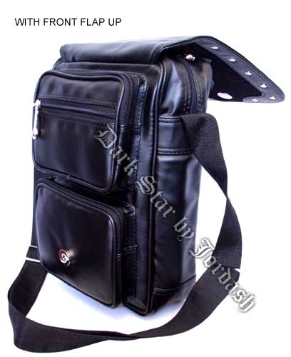 Dark Star PVC Black Spider Gothic Shoulder Bag. Dark Star PVC Black Spider Shoulder Bag. This is an awesome Gothic bag with many different compartments. It is made of PVC Pleather material on the outside with shiny PVC Spider motif. There is a PVC spider design on the front. There are studs around the spider. Fabric Lining. There is a main compartment with a large zipper opening, with a zipper pouch inside. The main compartment is 12 inches tall, 9 1/2 inches wide, and 3+ inches in depth. There are also side compartments which are postcard pouches. There are 2 compartments with zippers on them, and one of them has a separate zipper pouch on it as well. On the back of the purse there is another zipper large compartment. Great purse for clubbing but with lots of room for storage! The front has a close flap magnetic closure. The straps are made of comfortable canvas like material and they are fully adjustable up to 52 inches long. Can wear as a a shoulder purse or messenger style. Great gothic purse!
