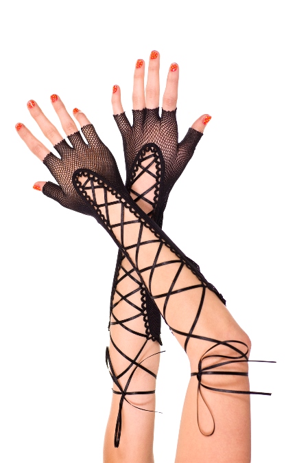 Fingerless Lace up Fishnet Elbow Length Warmer Black. Ties up the elbow. Suggested Fit 100lbs-175lbs, but item is stretchy and will fit most plus sizes.